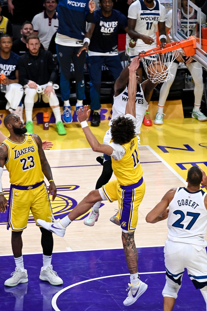 老詹和东契奇以身作则,文森特/里夫斯和里德/兰德尔抱摔,湖人拉满了单防和换防的对位防守硬度,但有些对位确实防不住就给了,宁愿森林狼众将突进去上空篮,也尽可能限制森林狼的突破分球找空位三分。