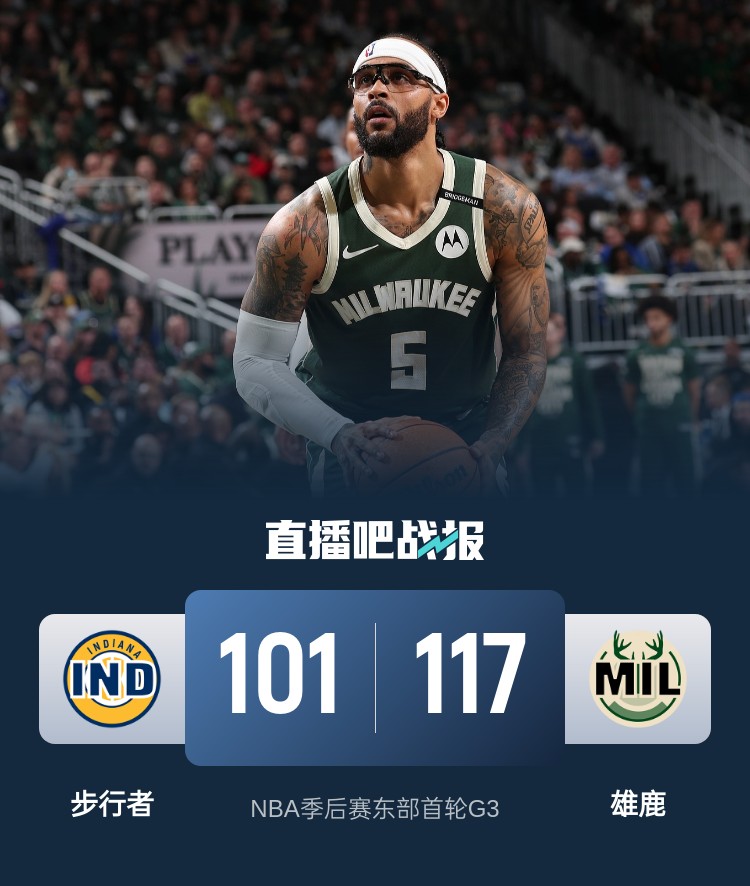 4月26日讯 NBA季后赛首轮,雄鹿回到主场迎战步行者。目前大比分雄鹿0-2落后步行者。