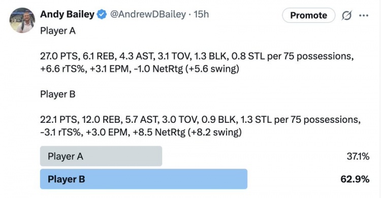 Andy Bailey还发起了投票,结果球员A的得票率为37.1%,球员B的得票率为62.9%。