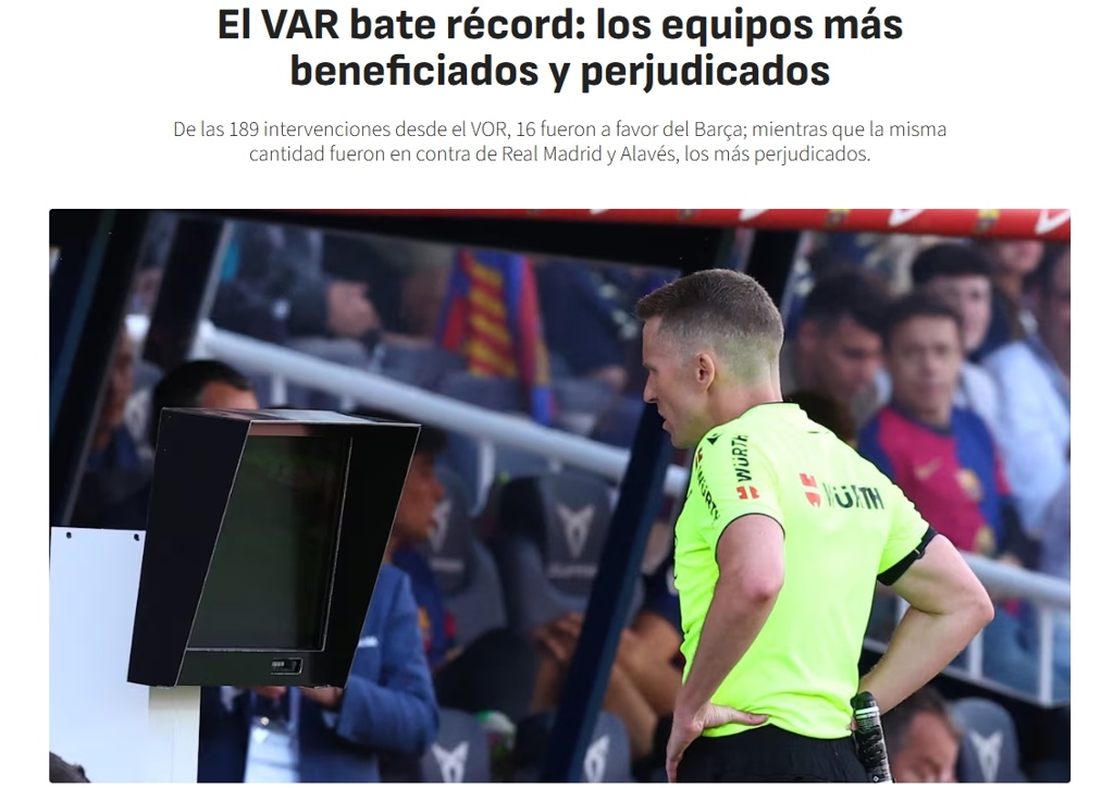 05月30日讯 《阿斯报》统计了2024/25赛季西甲VAR介入判罚情况,本赛季VAR共介入189次,为引进VAR后介入次数最多的一赛季。