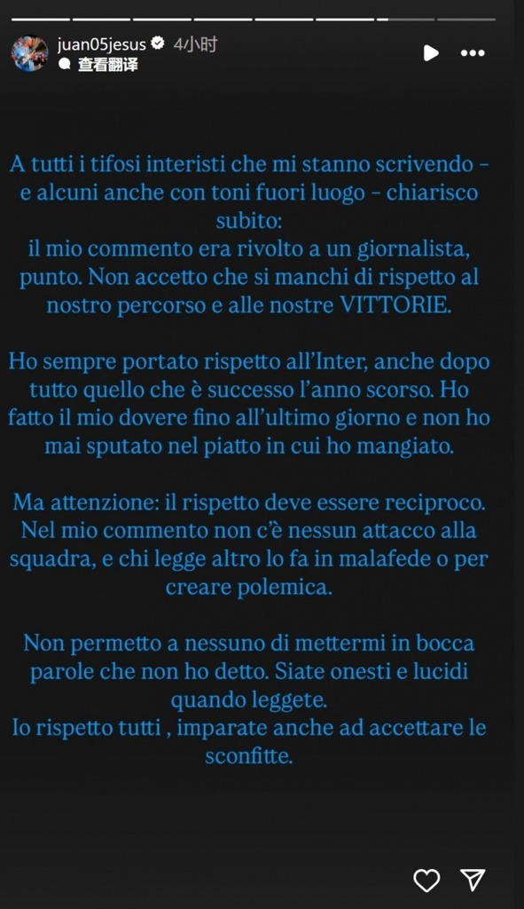 胡安-热苏斯写道:“致所有给我留言的国米球迷,包括一些言辞不当的球迷——我想要立即澄清。我的评论是针对一名记者,仅此而已。我不接受任何人对我们的历程和胜利缺乏尊重。