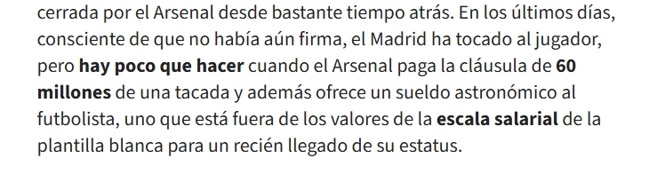 祖比门迪是皇马转会计划中遇到的一个小挫折,因阿森纳在相当一段时间前就已经运作得非常成熟,皇马很难再插手这笔敲定的交易。最近几天,皇马意识到转会尚未签字时,便接触了球员本人,可是阿森纳一次性支付了6000万欧元的解约金,还为球员提供了一份天文数字的薪水。祖比门迪的这份薪水超出了白衣军团的薪资结构范围,这几乎让皇马束手无策。