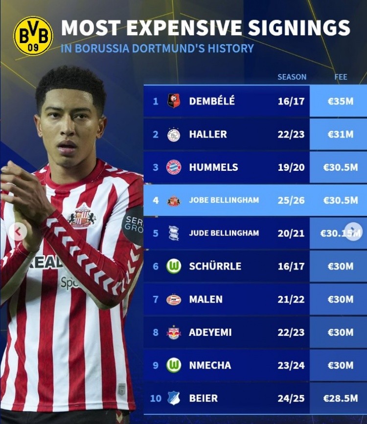 6月11日讯 多特已经官方宣布签下小贝林厄姆,据悉基础转会费3050万欧元,《转会市场》也统计了多特队史的引援榜单。