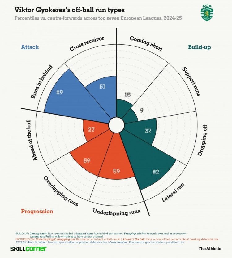 然而,约克雷斯的价值远不止于此。他不仅擅长精准射门和禁区内的抢点,还是一名出色的跑动者,速度快、爆发力强,并且具备在高强度下反复冲刺的能力。 通过SkillCorner的跑动数据分析可以看出,与欧洲顶级七联赛中的其他前锋相比,约克雷斯经常瞄准对方防线身后的空间,或者拉边跑动,乐于带球突破防守后内切射门。