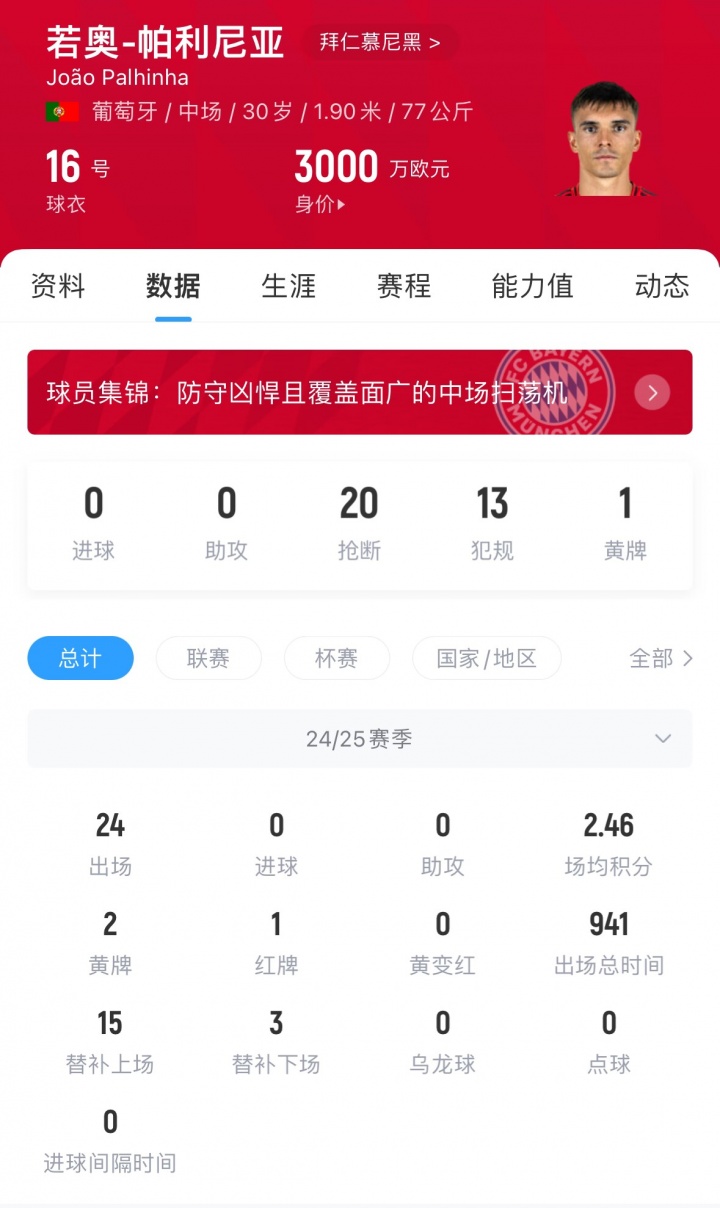 帕利尼亚去年夏天以5100万欧的价格从富勒姆加盟拜仁,但在孔帕尼的手下,他未能得到机会,他仅在德甲中首发7场比赛,上赛季共出场25次,没有进球或助攻,出场时间仅986分钟。他与拜仁的合同在2028年到期。