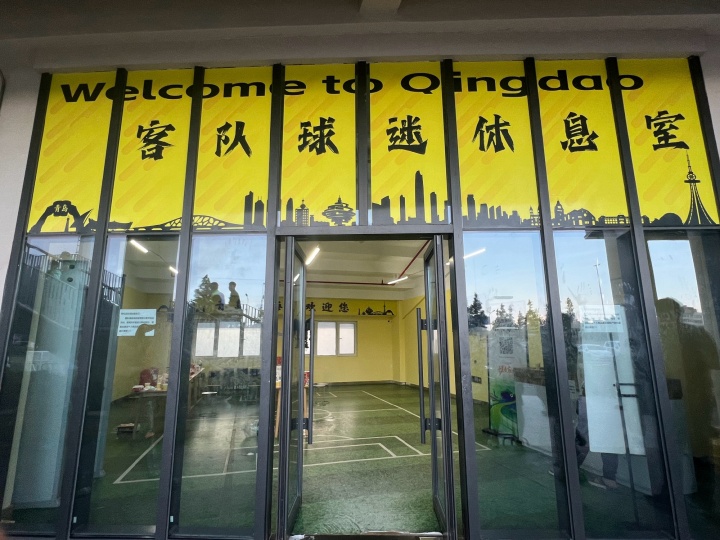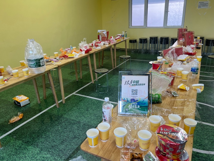 来到青岛西海岸的客队球迷区,人家赛区竟然在客队球迷休息室里准备了一堆吃的喝的,包括但不限于肯德基、方便面、矿泉水。