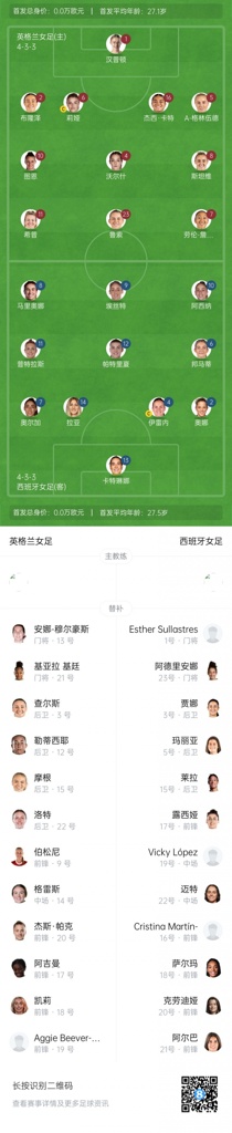 07月27日讯 女足欧洲杯决赛,英格兰女足vs西班牙女足的比赛将在明日凌晨0:00进行,赛前双方首发名单已经公布。