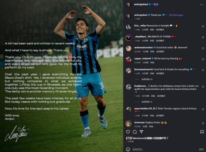 08月07日讯 亚沙里已官宣加盟米兰,球员在社媒发文告别了布鲁日。
